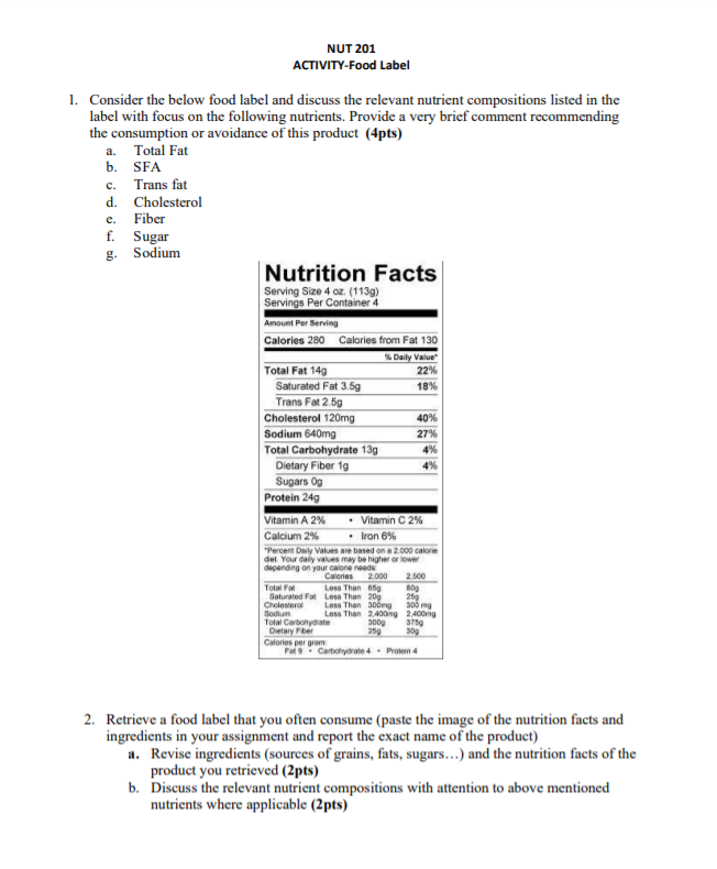 Lab 1 nutrition facts labels. Lab 1 Nutrition Facts worksheet-2.docx - Lab 1 - Course Hero LABEL INFORMATION FIBER ONE BAR KIND BAR Serving Size 1 bar, 23 g 1 bar, 40 gram Total Calories per serving 90 180 Total Fat (grams per serving) 2.5 g 15 g Sodium (milligrams per serving) 80 mg 140 mg Total Carbohydrate (grams per serving) 17 g 16 g Sugar (grams per serving) 5 g 5 g Fiber (grams per serving) 5 g 7 g Protein (grams per serving) 1... Lab 1 Nutrition Facts lab worksheet-1 - Lab 1 - Nutrition Facts Labels ... Lab 1 - Nutrition Facts Labels MUST BE SAVED AS A PDF OR WORD DOC! Nutrition Facts on your food labels are a great tool to use when planning meals and snacks. You are provided information on important nutrients and all ingredients to help make informed choices. In this lab, you will compare similar items to analyze key nutrients and ingredients. nutritiondata.self.comSELF Nutrition Data | Food Facts, Information & Calorie ... The Caloric Ratio Pyramid™ The Caloric Ratio Pyramid appears in every ND analysis, and also on ND's Total Consumption report. This symbol lets you see at a glance how the Calories in the food are distributed, and can help you determine if the food aligns with common macronutrient-based diet plans, such as low-carb (e.g Atkins™ or South Beach™), low-fat, high-protein, or Zone™. - Leading Nutritional Analysis, Calculator ... Food Manufacturing. Save thousands in lab and consulting fees by bringing nutrition analysis in house. With MenuSano, create compliant nutrition fact labels, store recipes securely in the cloud and conduct virtual recipe experimentation.