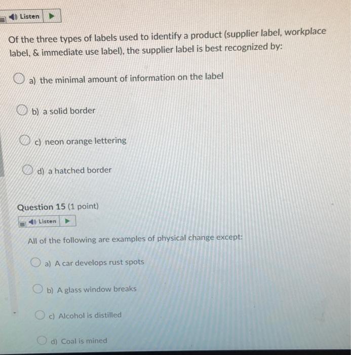 PDF Workplace Labels - WorkSafeNB Workplace Labels Guide for Employers and Employees The label is the employee's ˜rst source of information about the hazards of a product. In WHMIS 2015, the labels of hazardous products must display the information elements shown below: Product Identi˜er The product name exactly as it appears on the container and on the Safety Data Sheet (SDS). Workplace Label Templates for Commonly Used Chemicals Alternatively, download the UofT Workplace Label Template, type in the relevant information and print on Avery 60506 labels. WORKPLACE LABEL TEMPLATES A ACID POWER ACETAMINOPHEN ACETIC ACID (Glacial) By Percentage 30% Acetic Acid 10% Acetic Acid 5% Acetic Acid 3% Acetic Acid 1% Acetic Acid 0.4% Acetic Acid By Molarity 5 M Acetic Acid Unit 6 - Workplace Hazardous Materials Flashcards | Quizlet A) When a controlled product arrives at workplace. B) For normal day to day use. C) For use by one person at the workplace D) Workplace labels always need 7 parts E) Immediate use. B) For normal day to day use. A supplier label can: A) be replaced by a workplace label. B) have a solid border at certain times. C) show no more than three symbols. Is a supplier label the same as a workplace label? - Answers The answer is yes and no. A supplier label may wind up being a workplace label if it complies with OSHA standards and is used to identify the original contents once it enters the workplace.