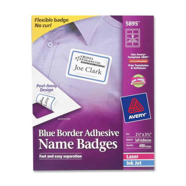Avery Flexible Adhesive Name Badge Labels - AVE5895 - Shoplet.com Write directly on them, or use free templates to easily add specialized messages, text, graphics and logos on the spot at meetings or seminars. Improved flexibility allows the badges to move with your clothing, ensuring that they stick securely to fabric without curling at the corners or falling off. Peel-away design allows for quick and easy name badge separation. 8 1/2" x 11" sheets for ...